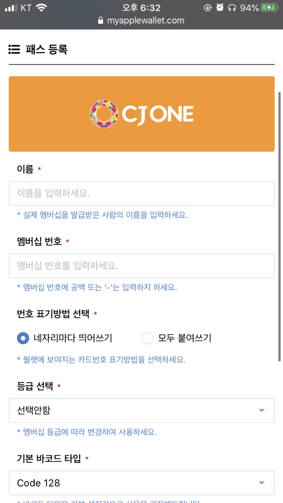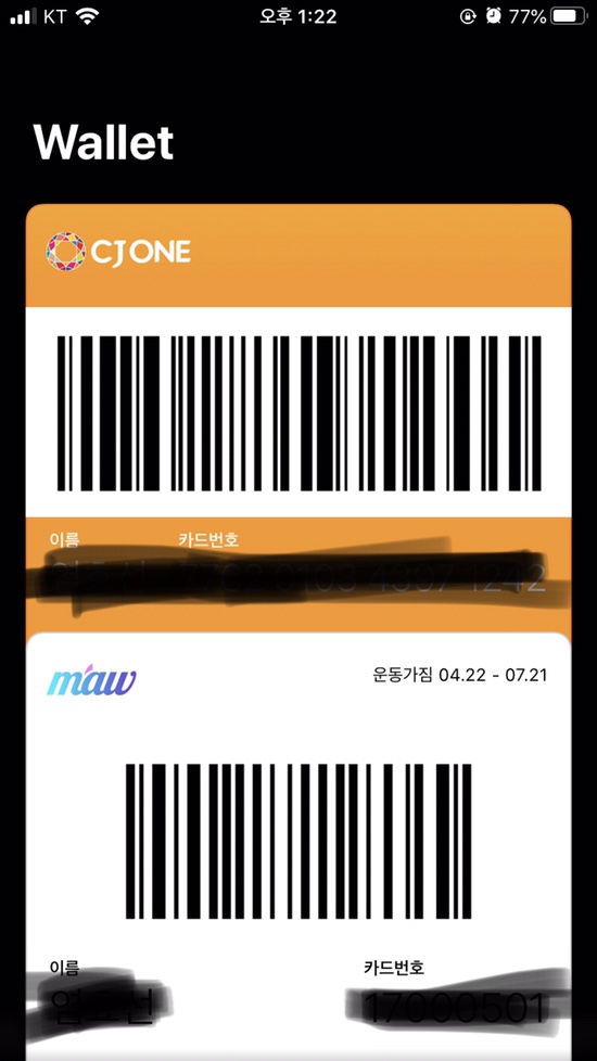 cj one 앱카드가 조금 무거운 편이고 접근성이 떨어지니 포인트 카드 번호를 애플 wallet에 등록하고자 한다.