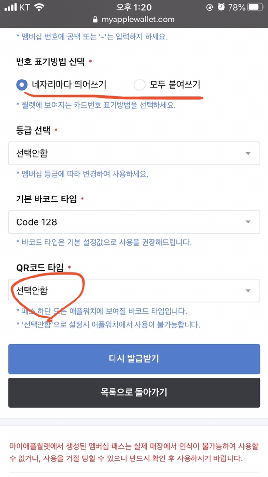 QR 코드타입은 바코드 형식이라면 '선택안함'으로 선택한다.