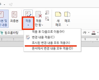 이는 검토 탭에서 적용 -> 표시된 변경 내용 모두 적용 버튼을 눌러주시면 됩니다.