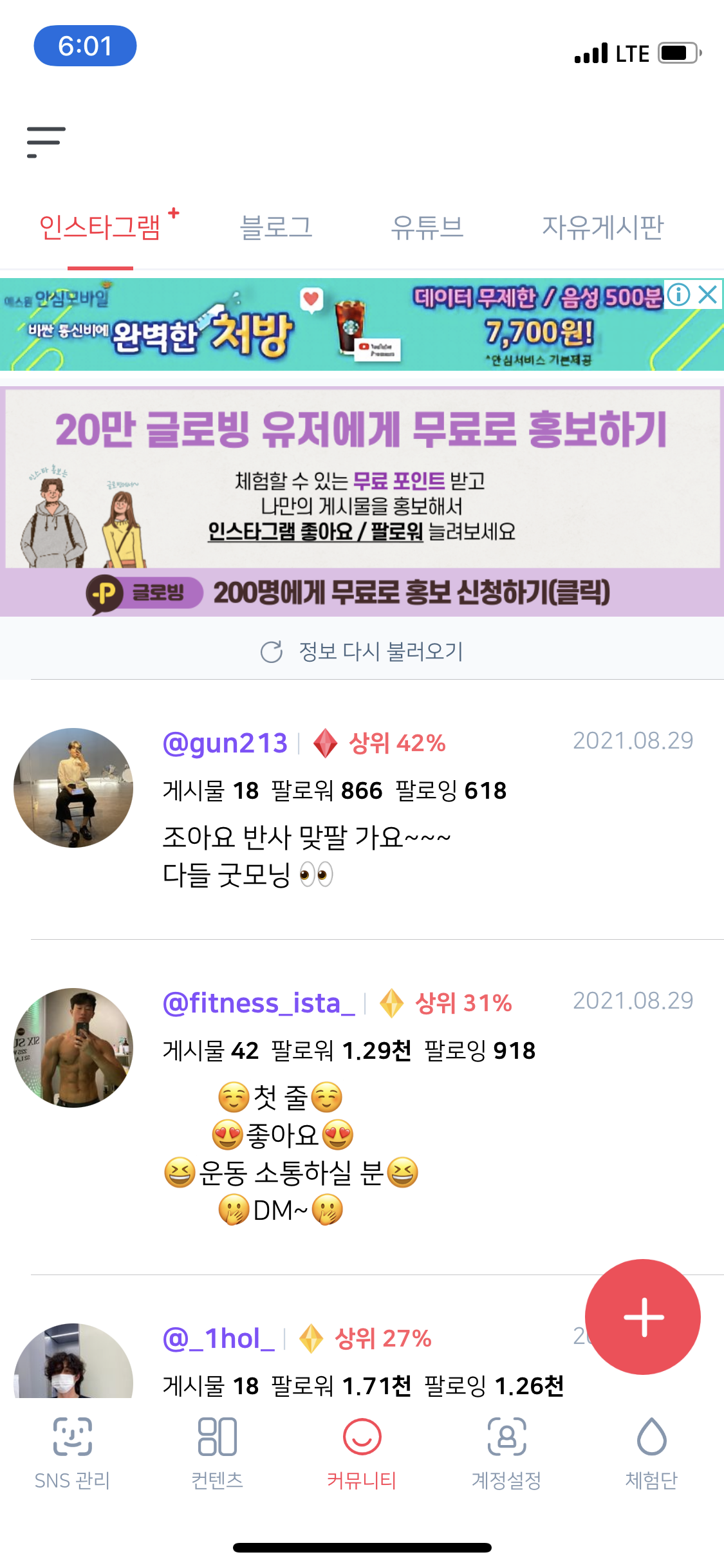 커뮤니티 탭에서 다양한 사람들이 맞팔 및 좋아요 품앗이를 하는 것을 볼 수 있습니다.
