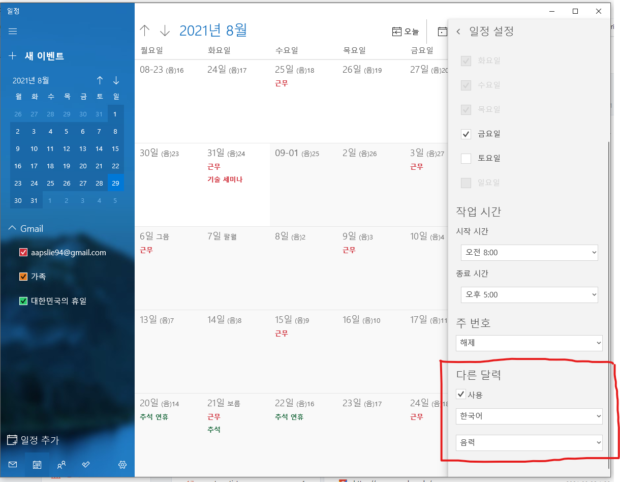 그 이후 아래로 스크롤 한 후 보이는 '다른 달력' 옵션에 체크를 해주세요.