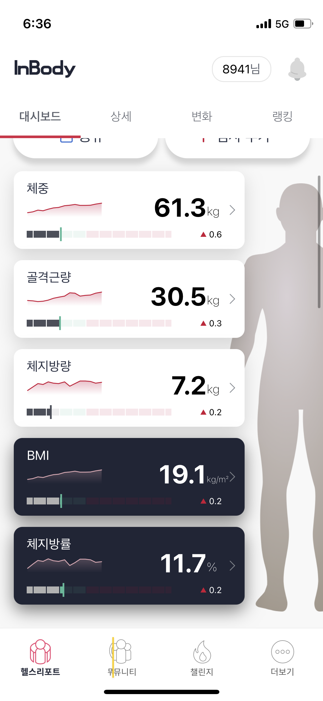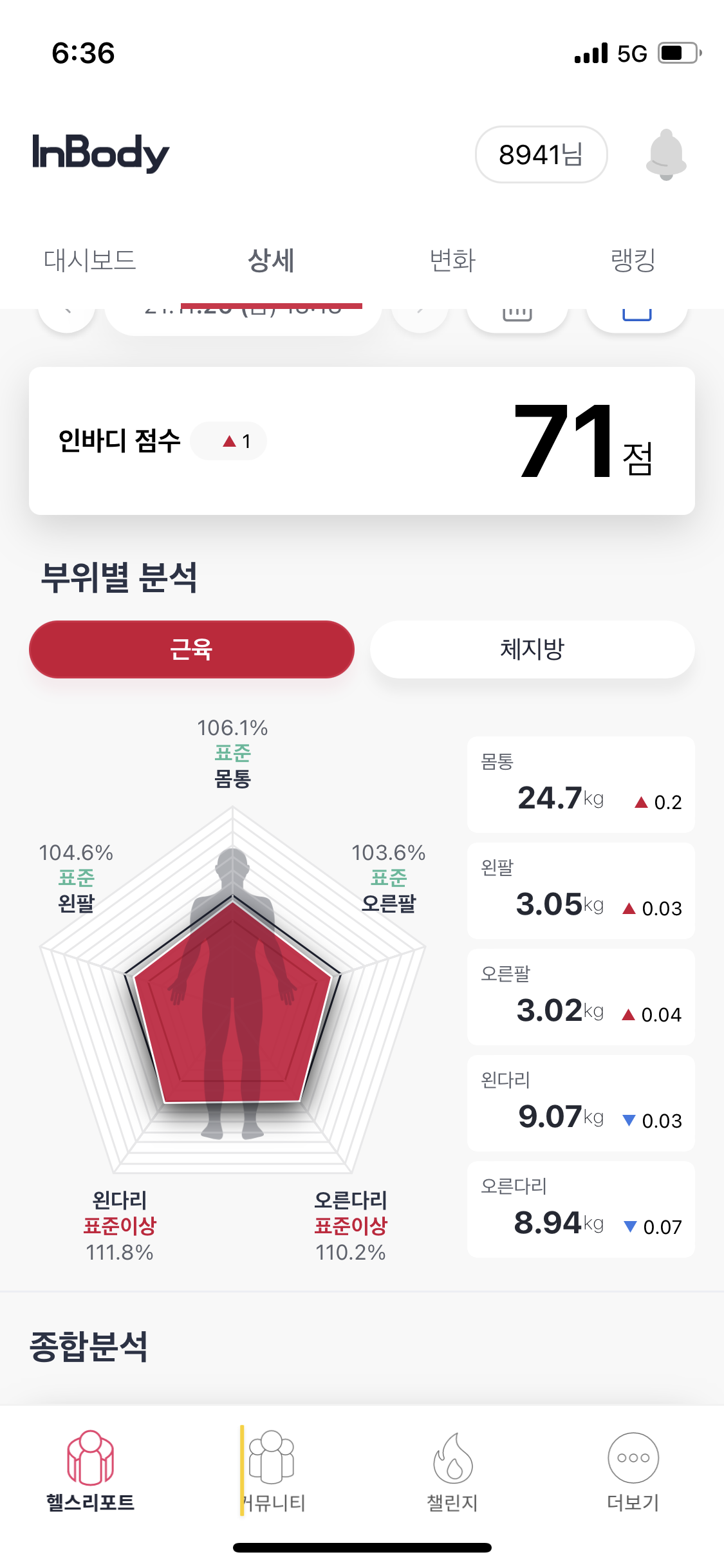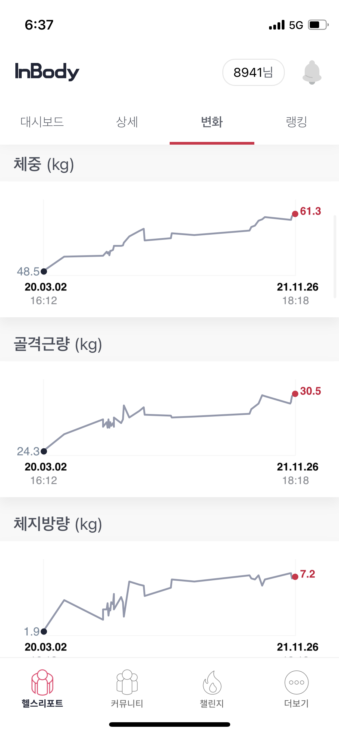 물론 밥을 좀 많이 먹고 가서 수분량이 많이 포함이 되어있겠지만 그래도 예전 48키로 때와 비교해보면 정말 장족의 발전인것 같다.