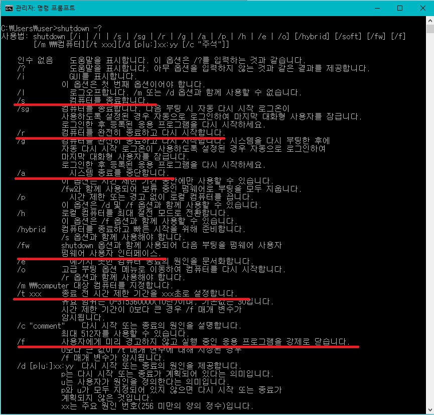 shutdown /f : 프로그램들이 실행 중이어도 강제로 시스템을 종료합니다.