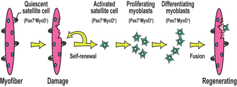 운동 혹은 외상으로 인해 근 섬유가 손상되면 곧 이어 회복이 진행되는데, 처음에는 염증 반응과 손상된 근육 세포의 괴사가 이루어진다. 이러한 부정적 환경에서 위성 세포가 활성화되고 증식이 시작된다. 염증 반응이 점차 감소하면서 위성 세포가 증식+분화하여 건강한 근 섬유로 재구성된다.