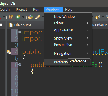 상단 탭에 window -> Preference 순으로 클릭하자.