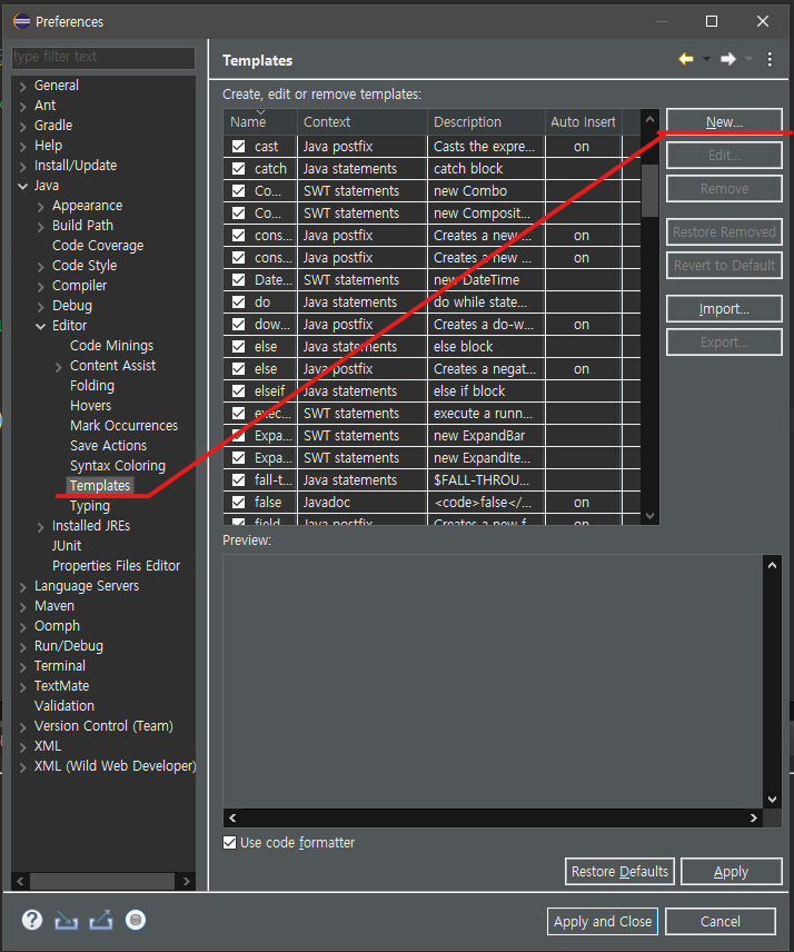 좌측에 Java -> Editor -> Templates 순으로 들어가보면