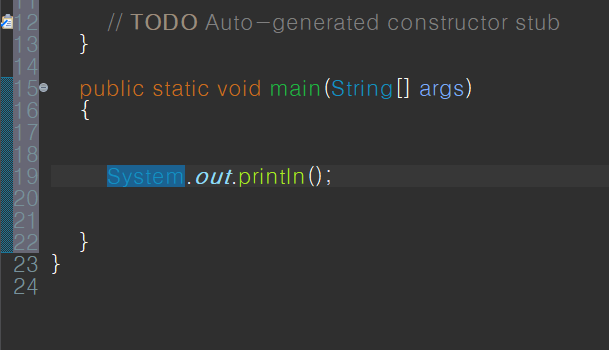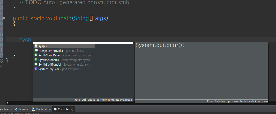 sysout 이라는 단축어를 입력한 후 Ctrl+Space Bar를 눌러서 자동 완성을 시킬 수 가 있다.