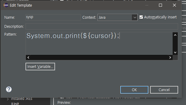 Pattern란에 System.out.print(${cursor}); 를 입력하자.